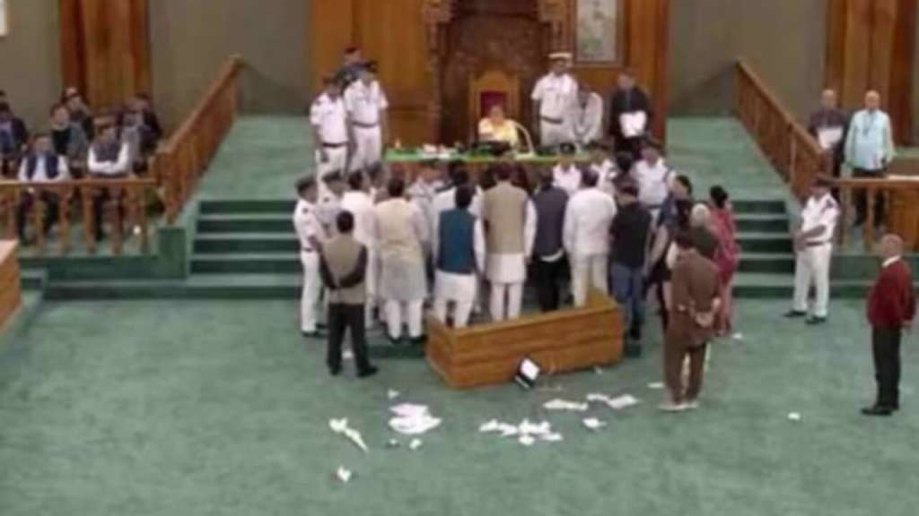 सुबह 11 बजे कार्यवाही शुरू होते ही विपक्षी विधायकों ने नारेबाजी शुरू कर दी। कांग्रेस नेताओं ने विरोध दर्ज कराते हुए कार्यसूची फाड़ दी और उसे सदन में उछाल दिया। विरोध इतना बढ़ा कि कार्यवाही को सात बार स्थगित करना पड़ा।