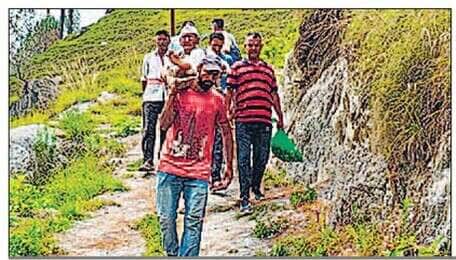 गांव में सड़क न होने से ग्रामीणों की दुश्वारियां — बीमार बुजुर्ग को डोली में लादकर सड़क तक लाए