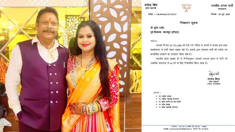 हरिद्वार। ज्वालापुर के पूर्व भाजपा विधायक सुरेश राठौर को पार्टी ने छह साल के लिए निष्कासित कर दिया है। राठौर पर पार्टी की छवि धूमिल करने और अनुशासनहीनता का आरोप है। उन्होंने सार्वजनिक मंच से यूसीसी का मजाक उड़ाया था और अपनी पहली पत्नी व परिवार के रहते एक अन्य महिला उर्मिला सनावर से विवाह किया। सोशल मीडिया पर दोनों के बीच विवाद और मुकदमों की चर्चा पहले से थी। सहारनपुर में हुई शादी का वीडियो वायरल होने पर पार्टी ने नोटिस जारी कर जवाब मांगा। जवाब संतोषजनक न होने पर प्रदेश अध्यक्ष महेंद्र भट्ट के निर्देश पर प्रदेश महामंत्री राजेंद्र बिष्ट ने छह साल का निष्कासन पत्र जारी किया।