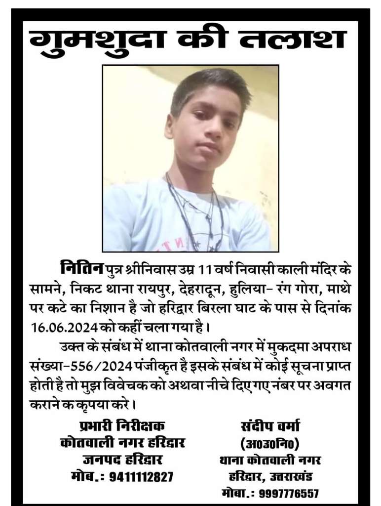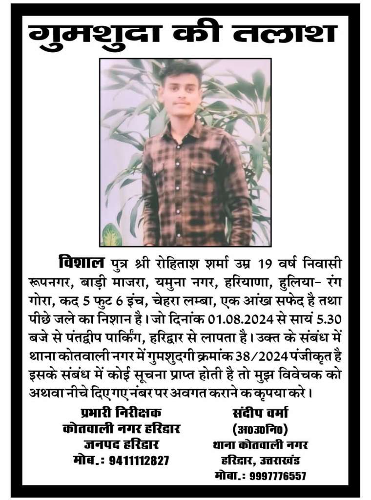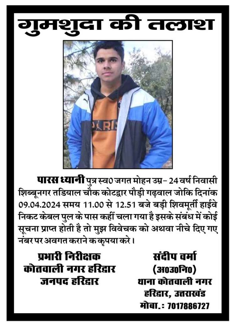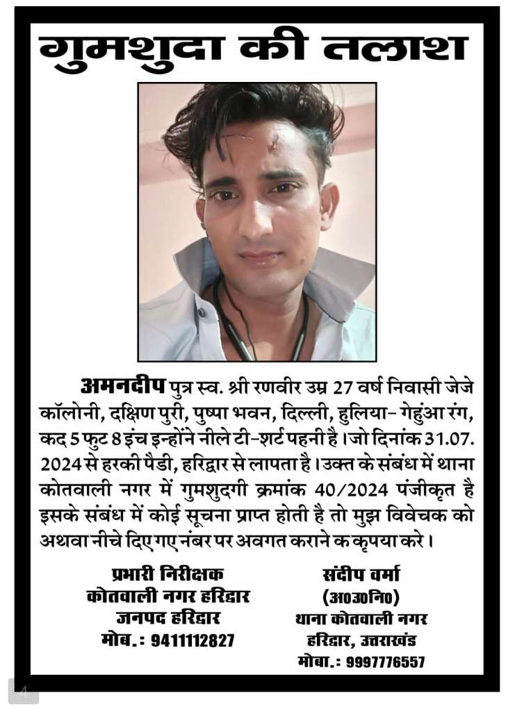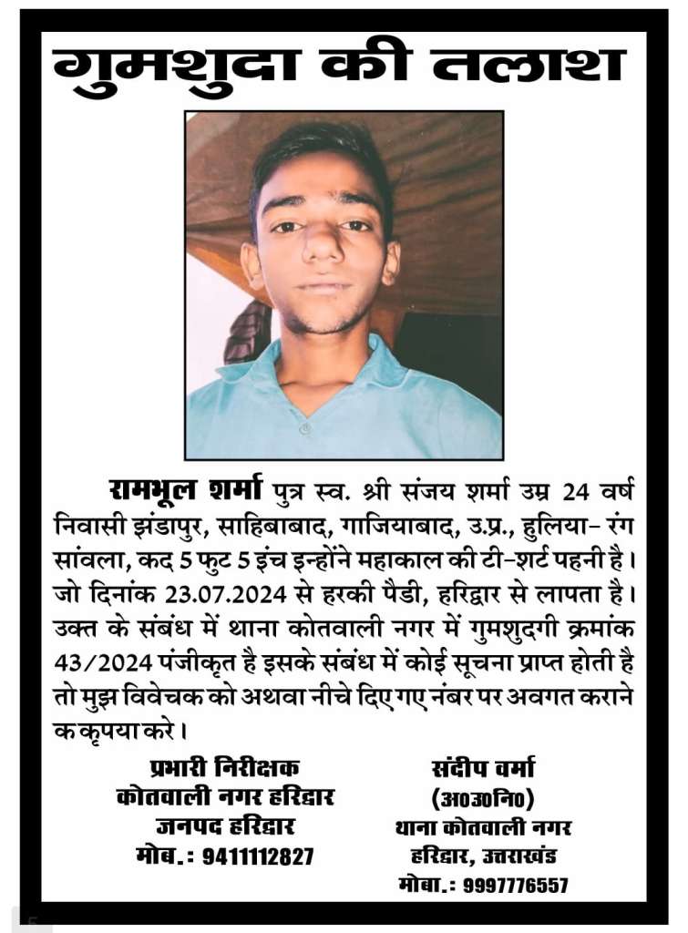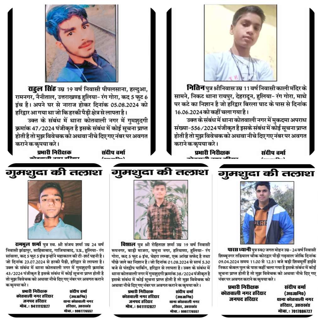 हरिद्वार में बीते एक वर्ष के दौरान अलग-अलग स्थानों से लापता हुए लोगों की तलाश तेज कर दी गई है। पुलिस ने सभी मामलों में हरिद्वार कोतवाली में गुमशुदगी दर्ज कर कार्रवाई शुरू कर दी है। इन गुमशुदा लोगों में विभिन्न उम्र और क्षेत्रों के नागरिक शामिल हैं। पुलिस का कहना है कि इनका अब तक कोई सुराग नहीं मिल पाया है। यदि किसी सज्जन को ऐसे किसी व्यक्ति के बारे में कोई जानकारी मिलती है तो तत्काल नजदीकी पुलिस स्टेशन को सूचना दें। पुलिस ने आमजन से सहयोग की अपील की है।