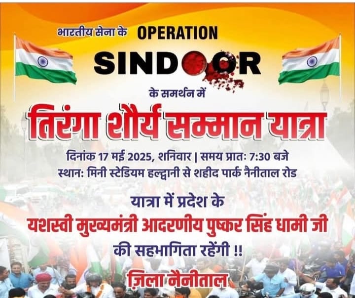 हल्द्वानी। कश्यप समाज हल्द्वानी के सभी सदस्यों से अनुरोध है कि वे 17 मई 2025, दिन शनिवार को आयोजित तिरंगा यात्रा में सम्मिलित हों। कार्यक्रम स्थल मिनी स्टेडियम हल्द्वानी में प्रातः 7:30 बजे पहुंचकर अपनी उपस्थिति दर्ज कराएं। यह यात्रा राष्ट्रभक्ति की भावना को सशक्त करने एवं हमारे वीर सैनिकों को सम्मान अर्पित करने का एक महान अवसर है। आपकी उपस्थिति से न केवल समाज की एकता प्रदर्शित होगी, बल्कि देश के प्रति सम्मान भी व्यक्त होगा।