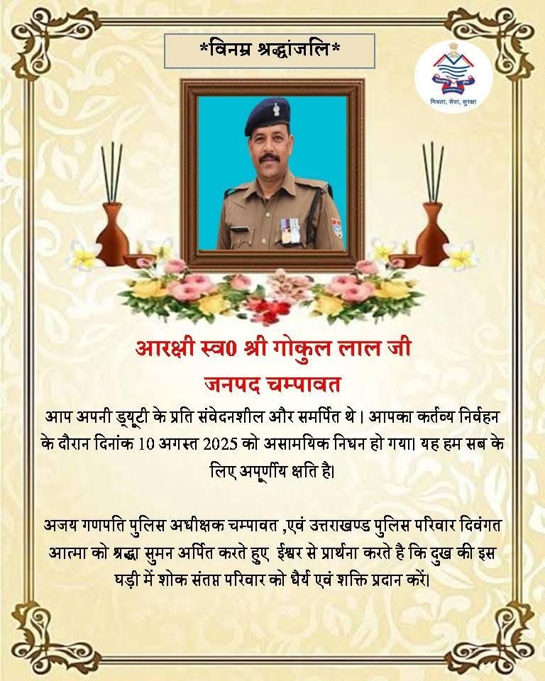 ड्यूटी के दौरान घायल हुए आरक्षी गोकुल लाल का असमय निधन, चम्पावत पुलिस परिवार शोकाकुल