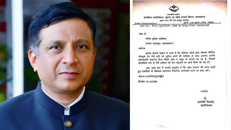 महानिदेशक सूचना बंशीधर तिवारी ने सोशल मीडिया पर अभद्र टिप्पणी और झूठे आरोप लगाने वालों के खिलाफ SSP देहरादून से शिकायत की है। मामले की जाँच...