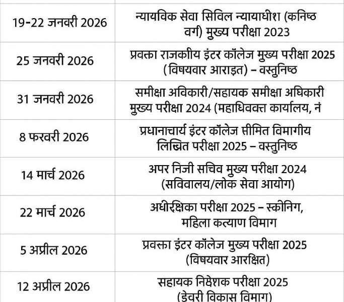 हरिद्वार। उत्तराखंड लोक सेवा आयोग (UKPSC) ने बुधवार को वर्ष 2026 के लिए 12 प्रमुख परीक्षाओं का वार्षिक कैलेंडर घोषित कर दिया। परीक्षाएं 19 जनवरी 2026...