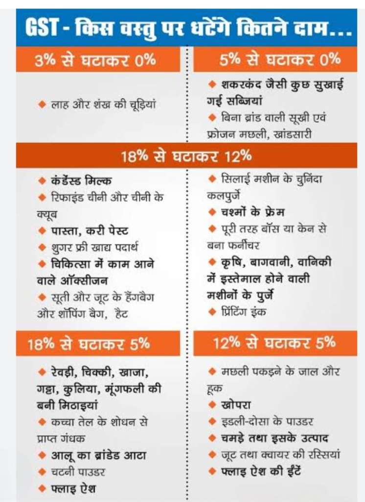 उपसचिव मनु अग्रवाल ने बताया कि मौजूदा समय में जीएसटी के 0%, 5%, 12%, 18% और 28% स्लैब हैं। लेकिन अब इन्हें सरल बनाकर सिर्फ दो ही स्लैब रहेंगे। विशेष दरें केवल कुछ चुनिंदा वस्तुओं पर ही लागू होंगी।